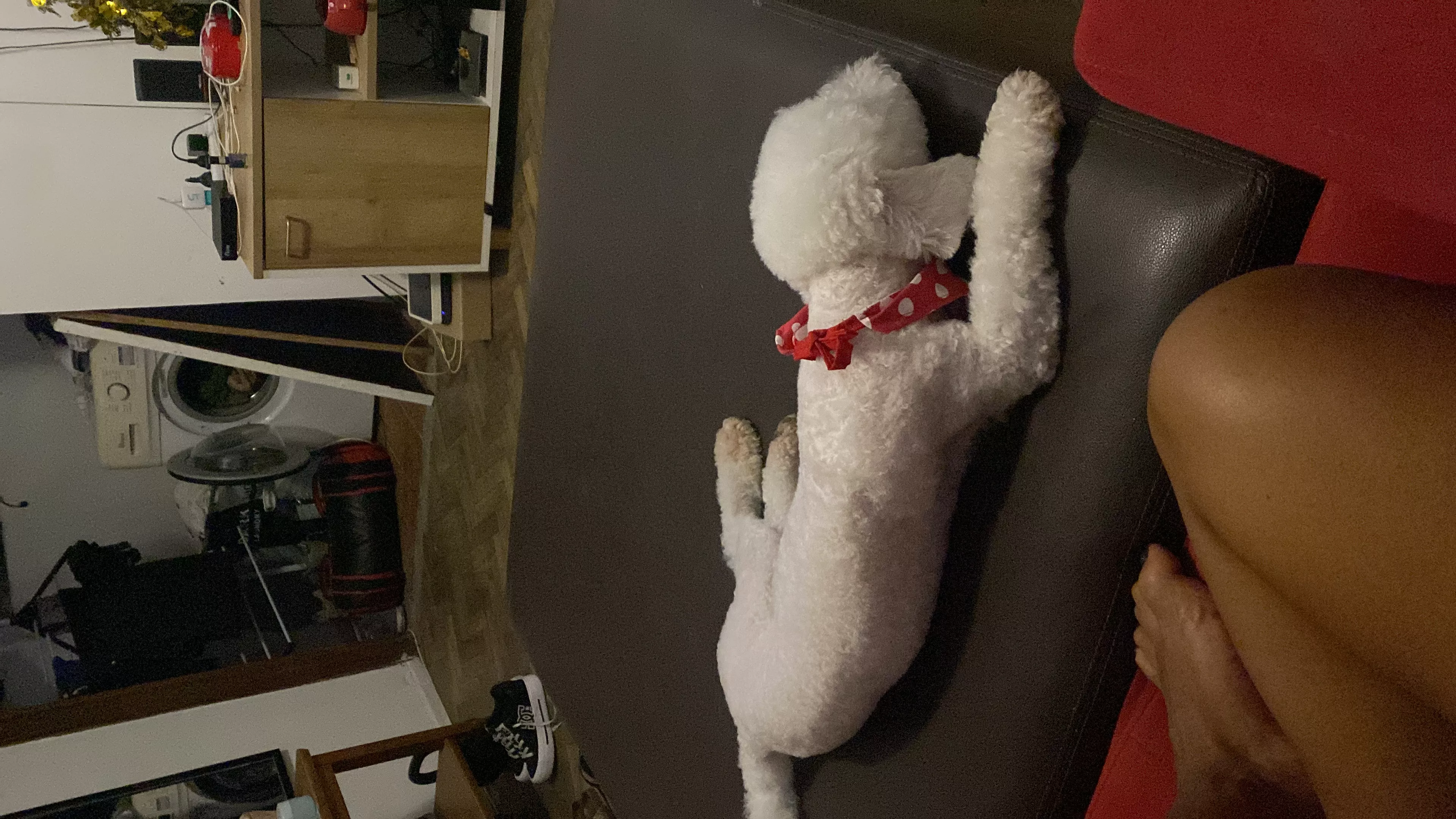 Es flaquito, saltarín, mimoso, no le gusta que le toquen la cola y las caderitas.